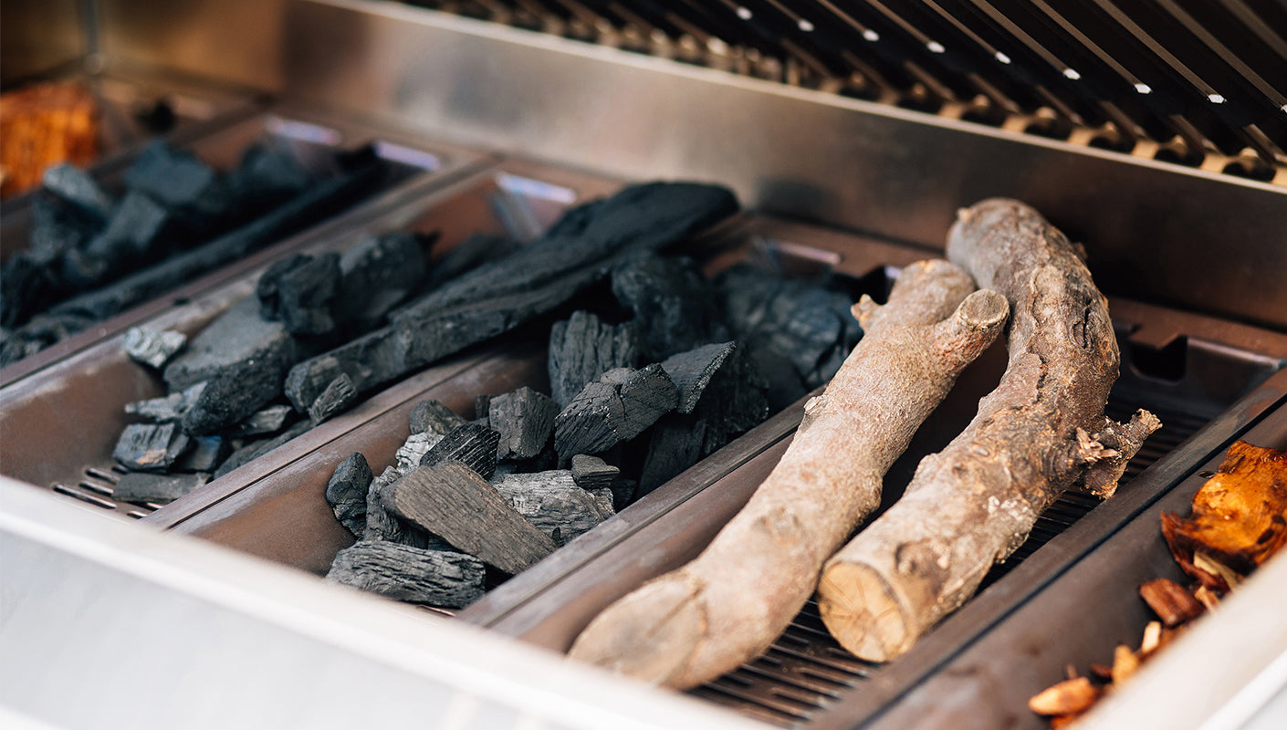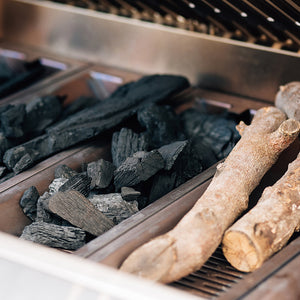 Load your fuel trays with the fuel of your choice—choose wood logs, wood chunks, charcoal, lump coal, wood chips, or a combination. Easily lift up and down the patented V-grates using our proprietary grate-lifting tools.
